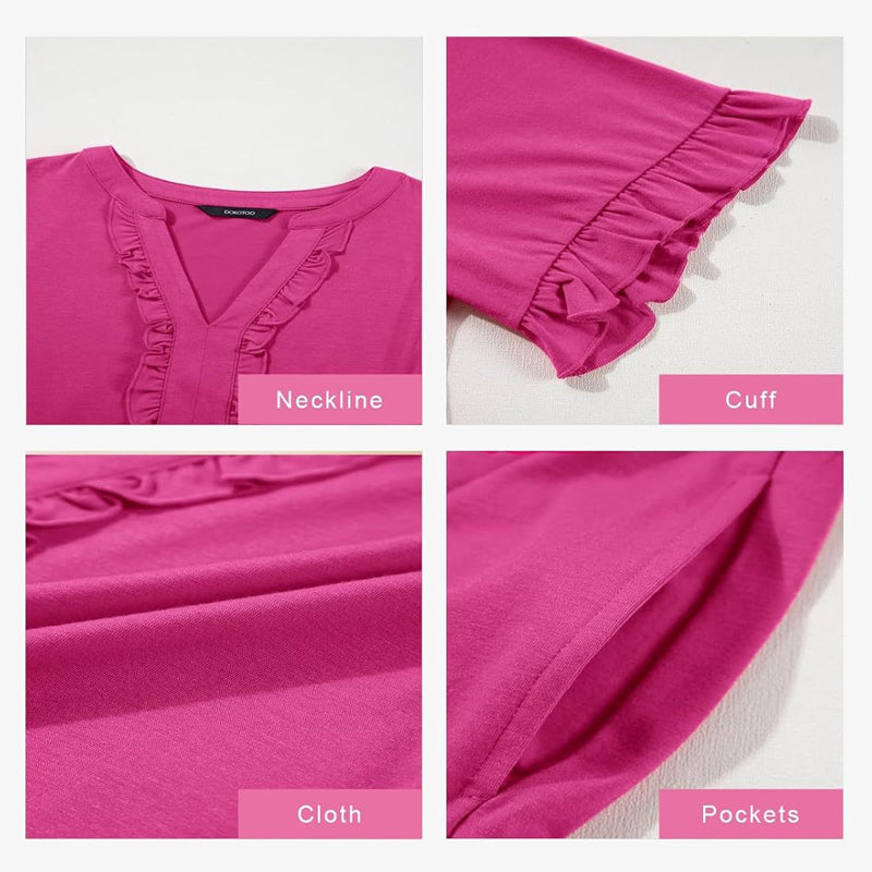 BEZAUBERNDE RÜSCHENDETAILS: Der dezente Rüschenbesatz am V-Ausschnitt und Saum verleiht dem Kleid eine kokette, feminine Note und unterstreicht seine mühelose Eleganz. Perfekt, um Persönlichkeit zu verleihen, ohne zu auffällig zu wirken.